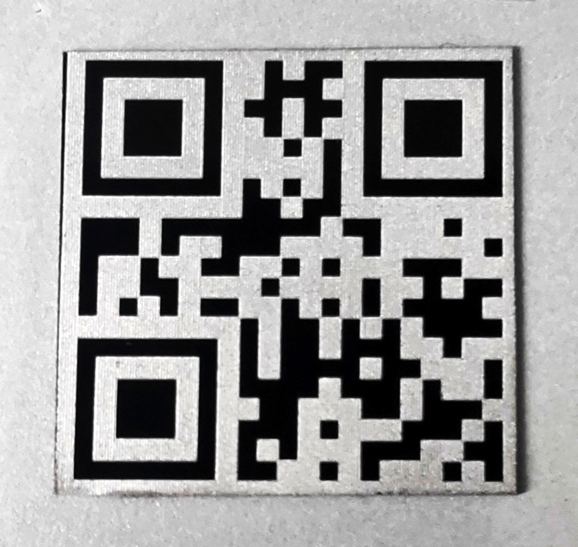 아래는 지름 15mm 써지컬스틸 원형팬던트에 8x8mm 사각형 QR코드를 레이저각인한 결과물이며, 인식이 매우 잘됨. 황동(Brass) 및 알루미늄 같은 재질에도 잘 됨.