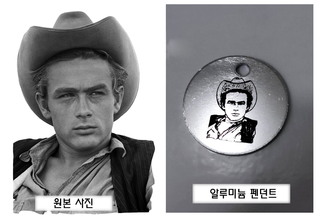 아래는 애완동물인 강아지(pet)의 사진을 이용하여 스테인레스 스틸(써지컬스틸)에 레이저각인 한 샘플과 인물사진을 이용한 각인샘플들.
