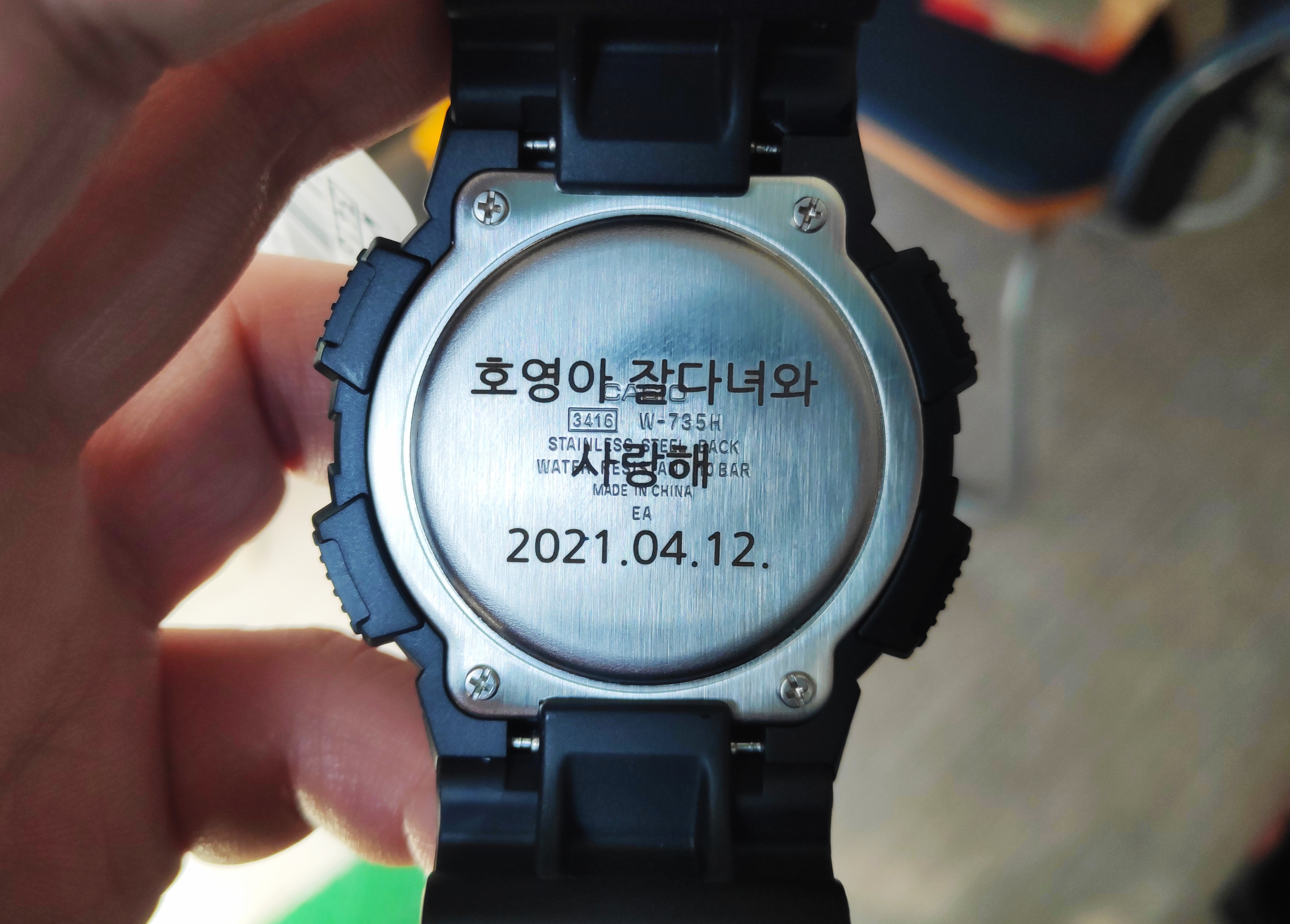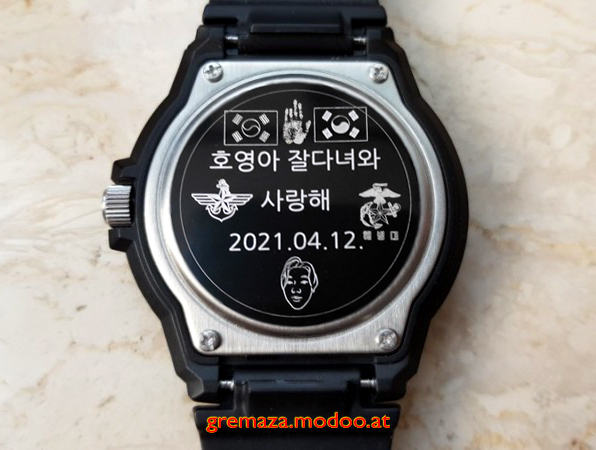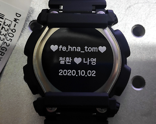 아래는 군입대하는 남자친구에게 전자시계를 선물하면서 시계 뒤에 아래와같이 메세지를 레이저각인하였으며 결과물에 매우 만족하였음.