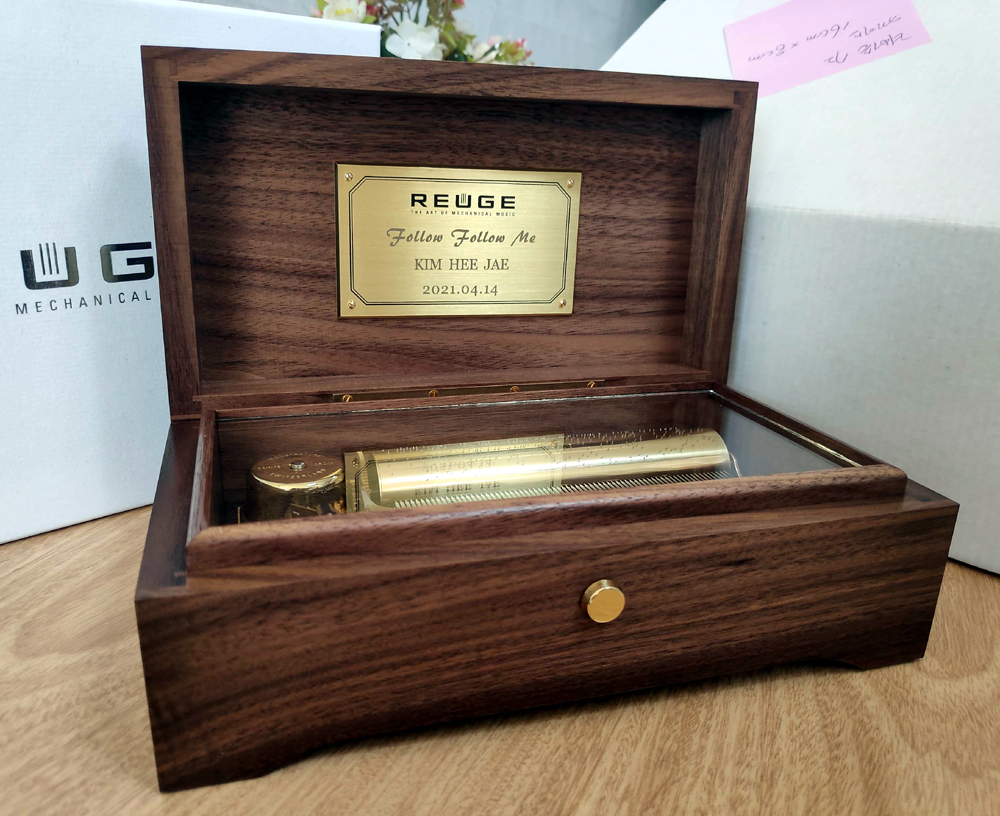 아래는 트로트가수 김희재 팬카페가 주문한 선물용오르골 황동판에 글자를 레이저각인한 것임.