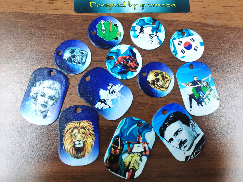 아래는 UV DTF 방식과 스크래치에 강한 UV 프린팅 포토 메탈 팬던트 샘플입니다. 황동, 알루미늄, 스테인레스스틸 등에 적용이 가능합니다. 도안(일러스트레이터, psd 등)을 미리 준비하여 의뢰하시면 됩니다.