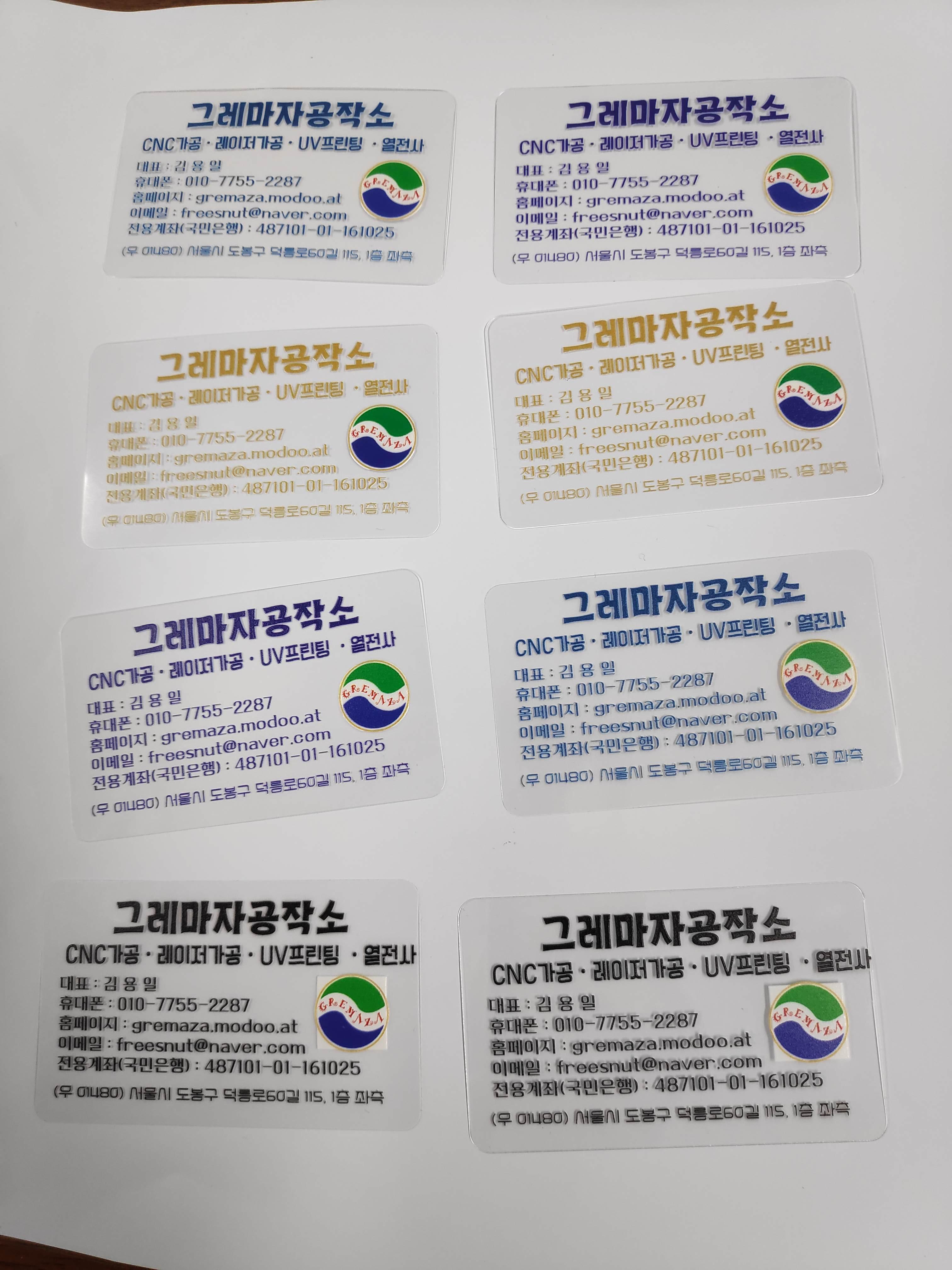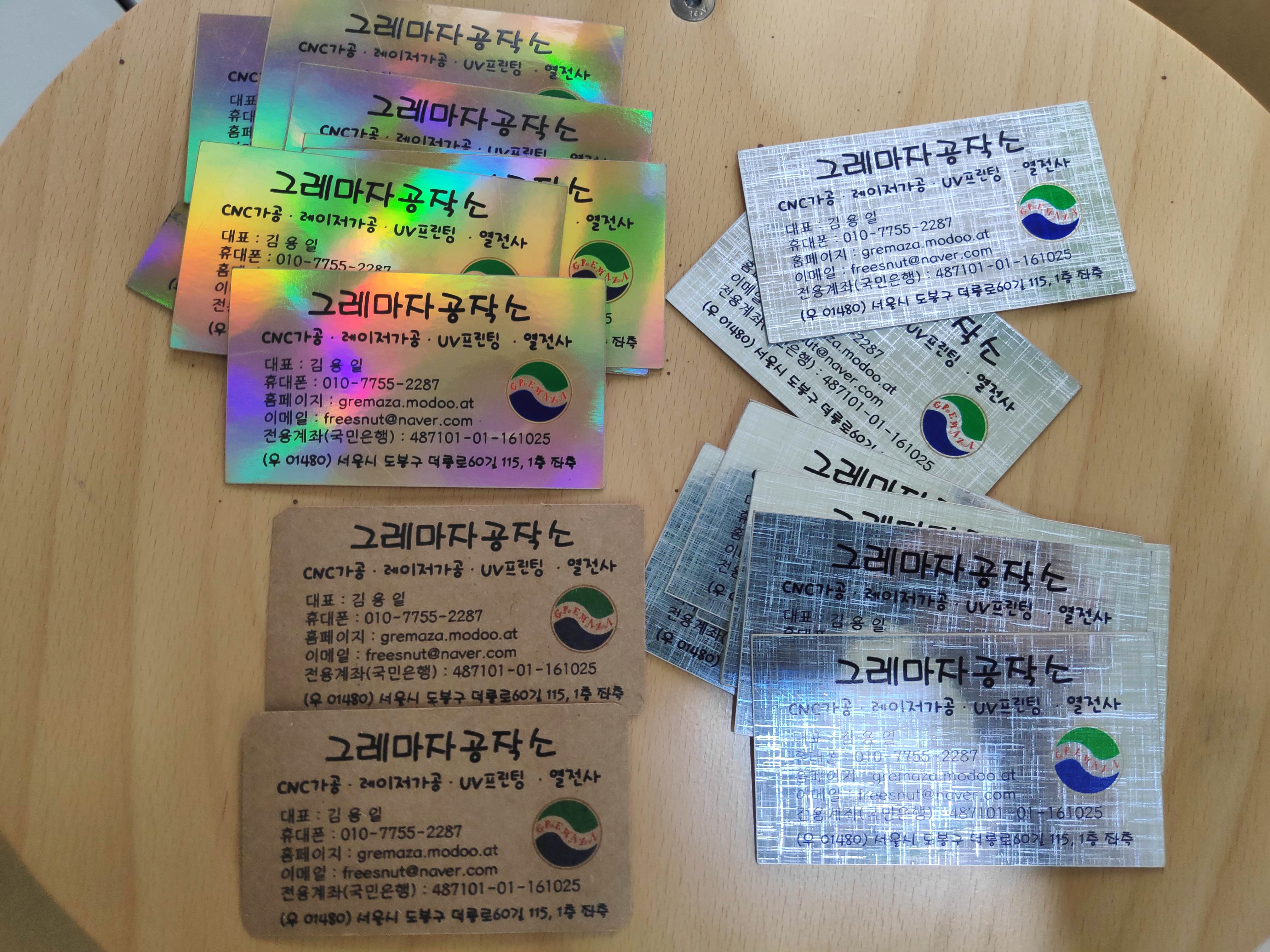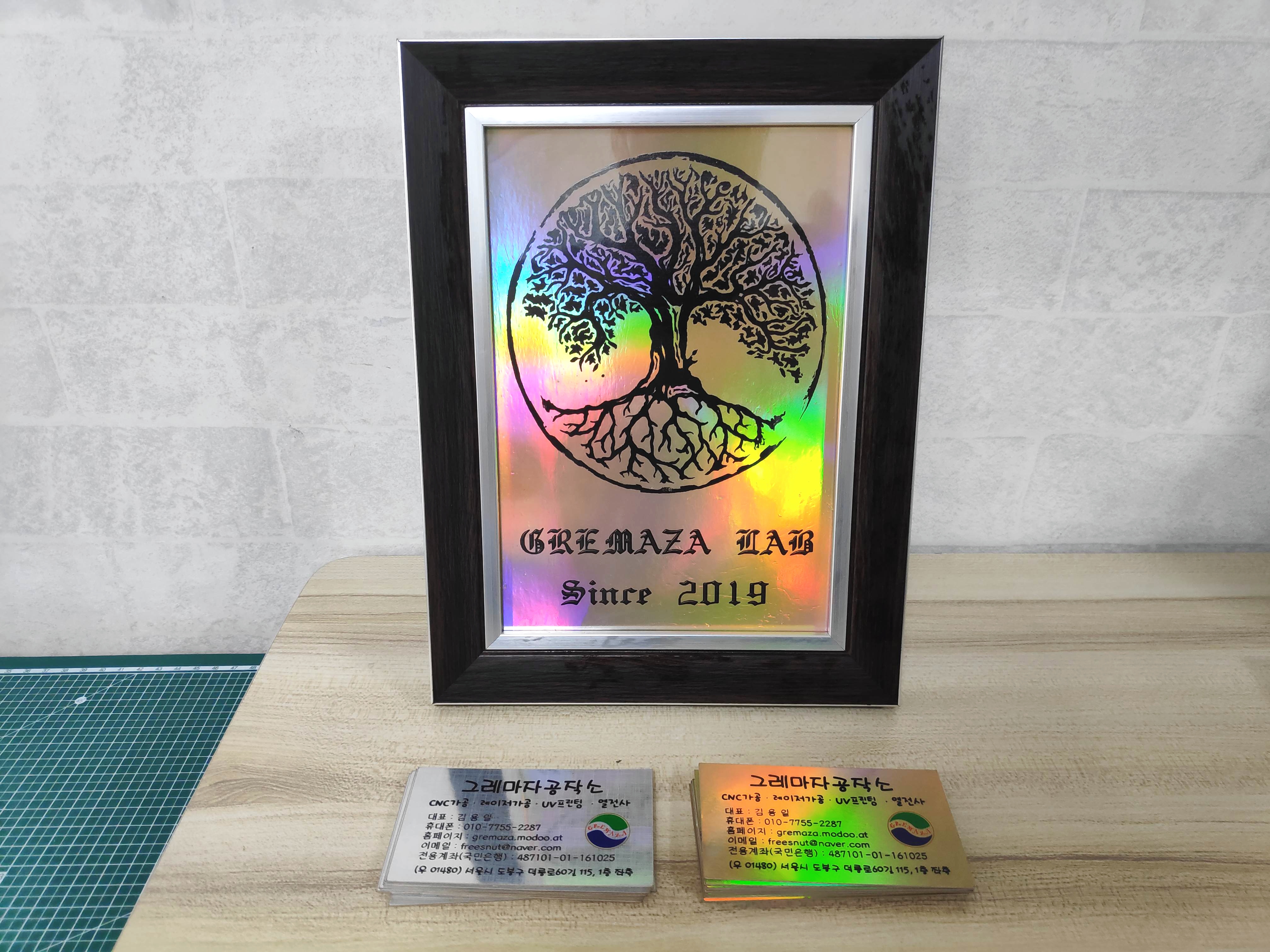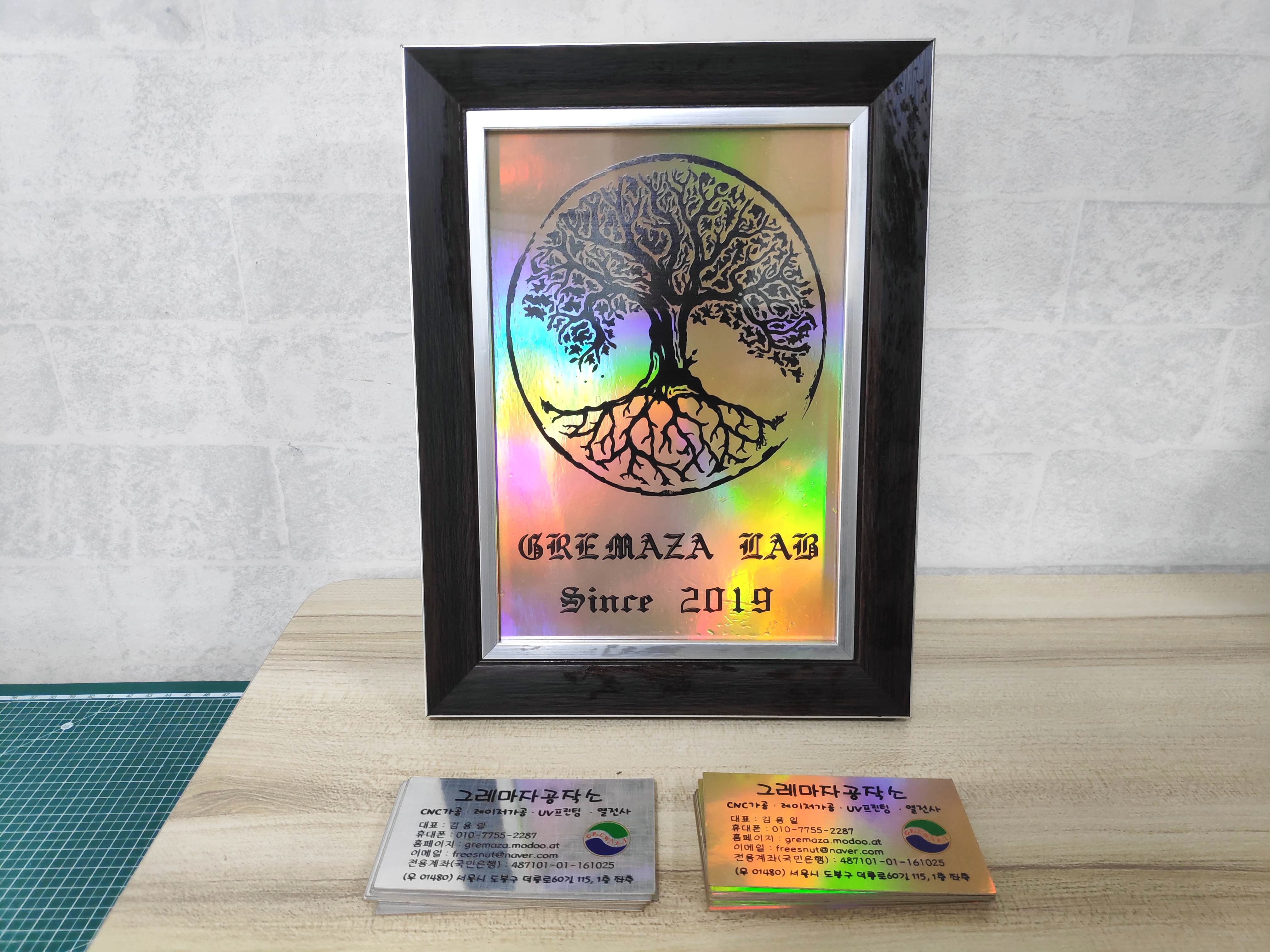 가게에 쓰지않던 액자와 부족한 명함을 UV프린팅과 홀로그램지를 이용하여 샘플로 만들어보았습니다.
