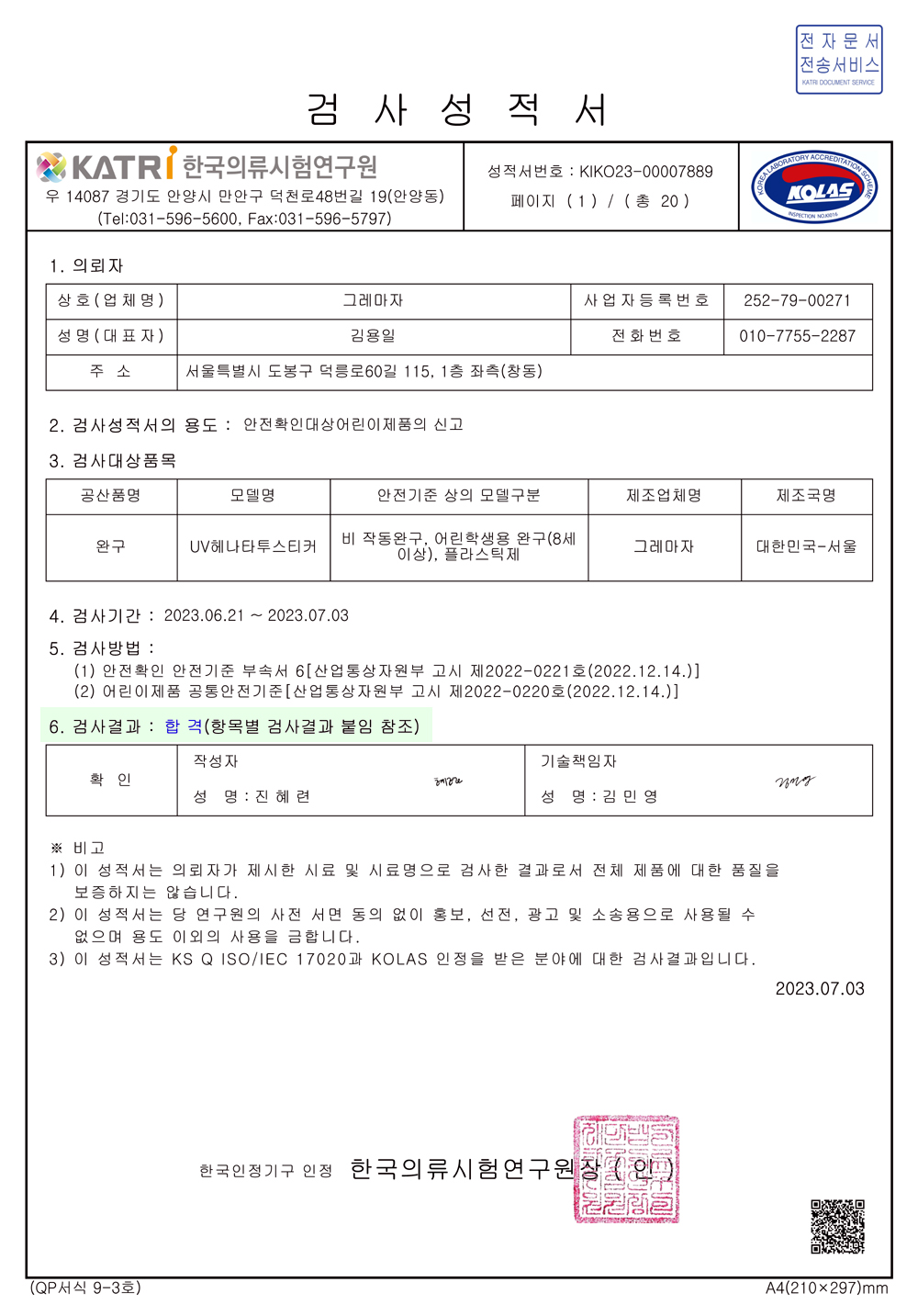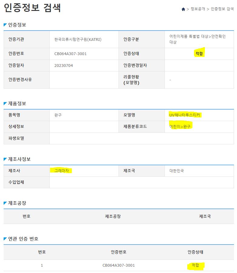 본 업체가 직접 개발한 UV헤나타투스티커가 아래와 같이 어린이제품안전확인시험을 통과하였습니다.