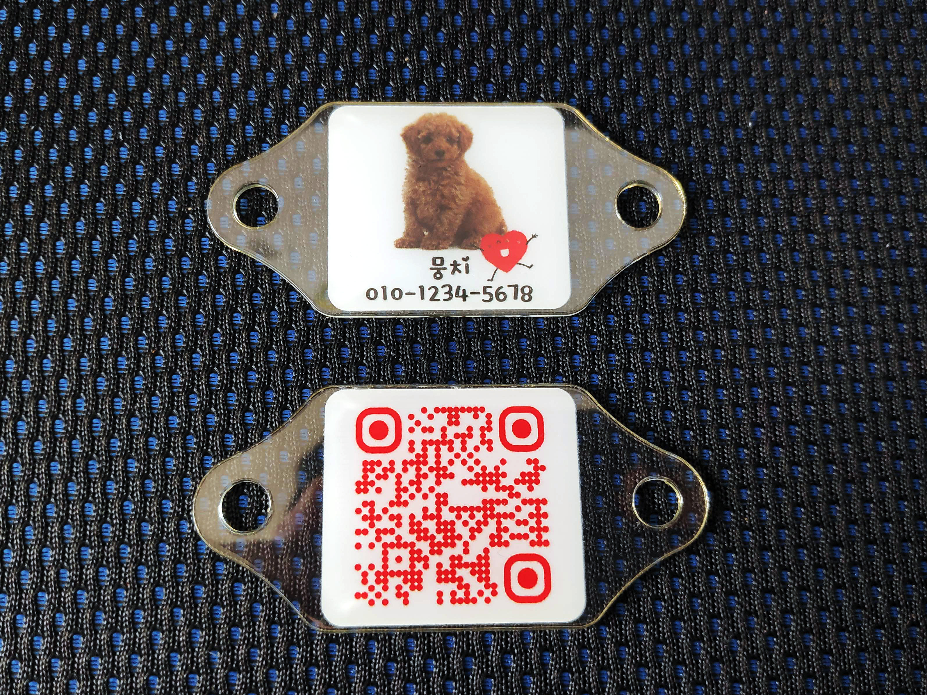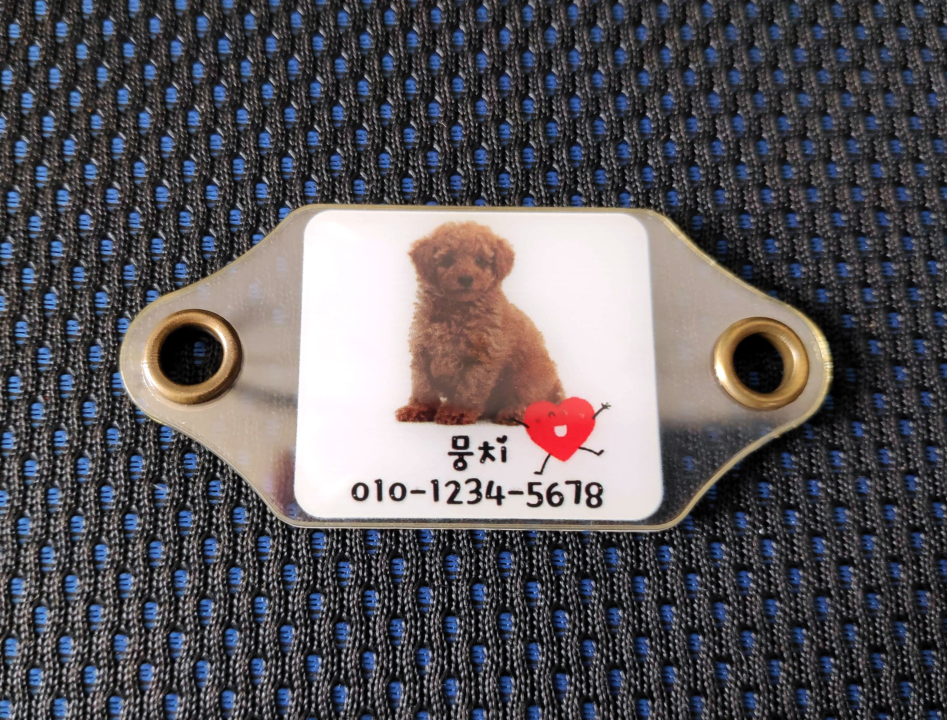 이번에는 저희가 개발한 UV양면아크릴네임택(nametag)을 적용한 동물이름표(pet nametag) 샘플을 소개드립니다.