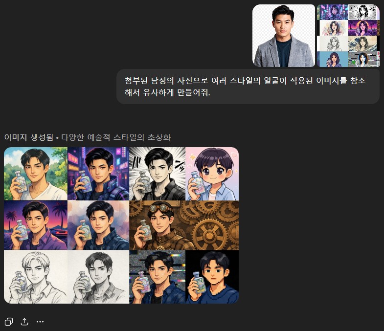 AI에 2장의 이미지(인물사진, 여러스타일이 적용된 참조용 이미지)를 아래와 같이 입력 후 이미지를 생성하는 테스트를 하였으며, 작업은 가능하며, 결과는 AI마다 다름을 알 수 있음.
