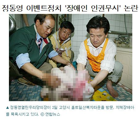 정 의장은 목욕탕에서 발가벗은 송모씨(30)를 목욕시켰고 언론사 카메라들이 정 의장 뒤를 좇으면서 이를 담아냈다. 송씨는 알몸으로 터지는 플래쉬 세례 속에 무방비로 노출돼있었다. 정 의장 옆에 있던 최성 당선자는 “제일 유명한 분한테 너 머리 감는다”는 말을 던지기도 했다.