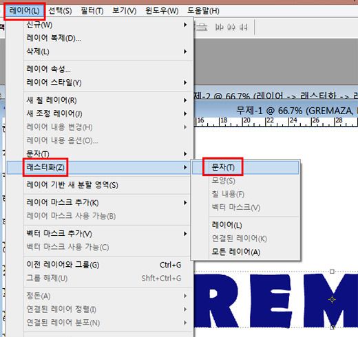 (3) 문자를 선택한 상태에서 레이어-래스터화-문자를 클릭합니다.