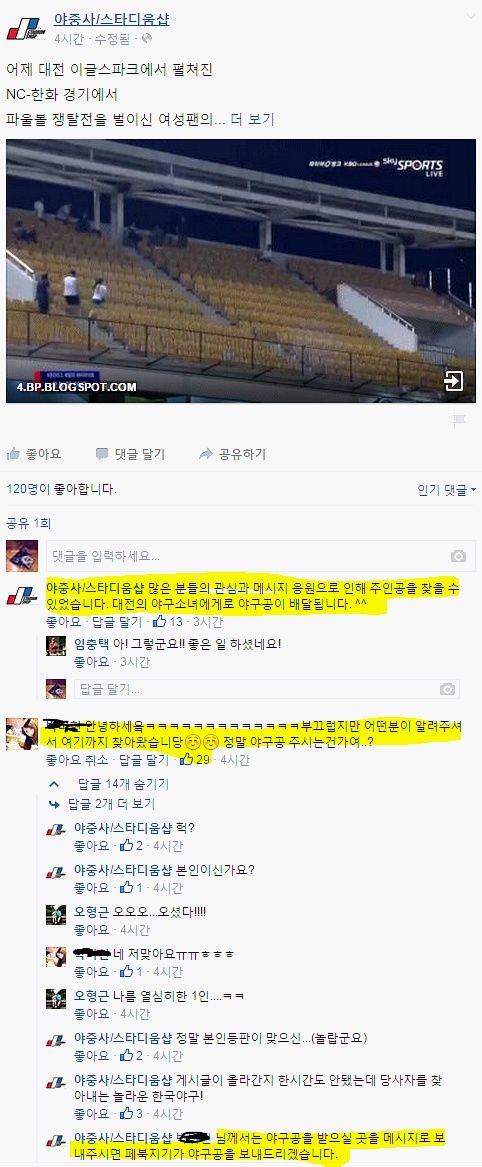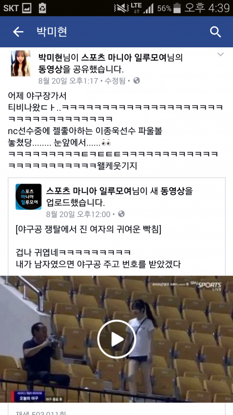 [펌] 파울볼 줍기 대결에서 진 야구장녀
