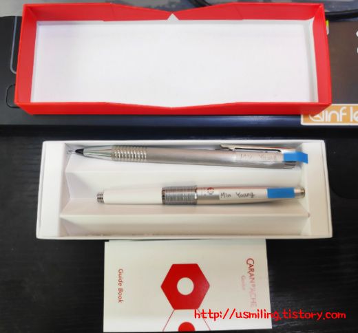 아래는 택배로 접수 받은 선물용볼펜과 샤프세트로 영문이름을 각인한 사진임.