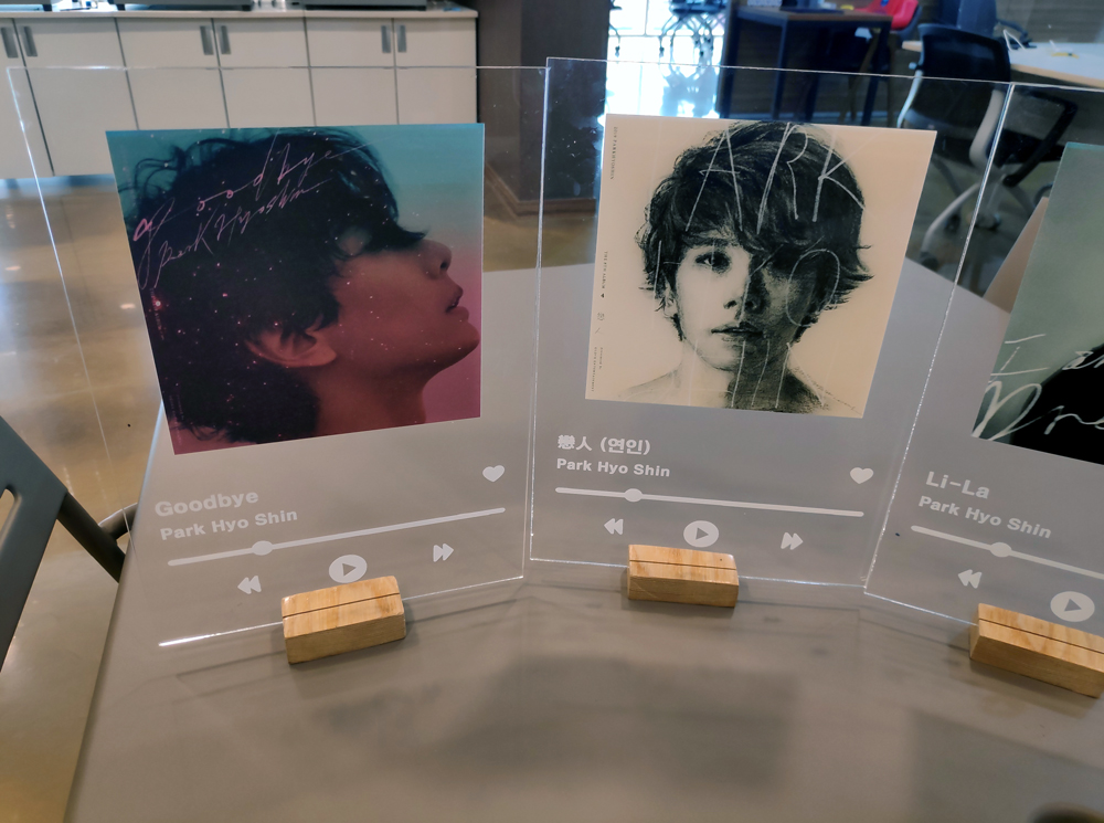 가수 박효신의 팬인 고객의 의뢰로 투명아크릴판에 이미지를 UV프린팅을 한 후, 나무고정판에 꽂아 스탠드로 제작함. 명함 및 안내판으로도 제작이 가능하고, 인테리어소품으로도 활용가능함.