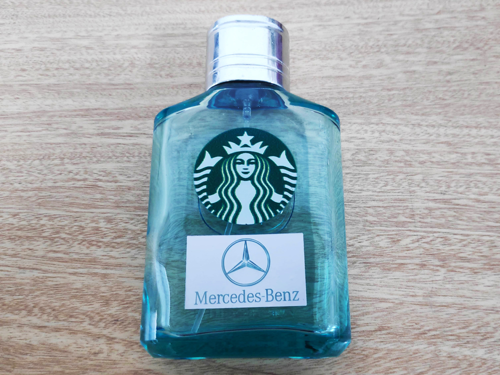 아래는 향수병의 유리용기표면에도 스티커샘플을 부착해본 것입니다. 유리와 같은 매끈한 표면에도 잘 붙는 것을 알 수 있습니다.