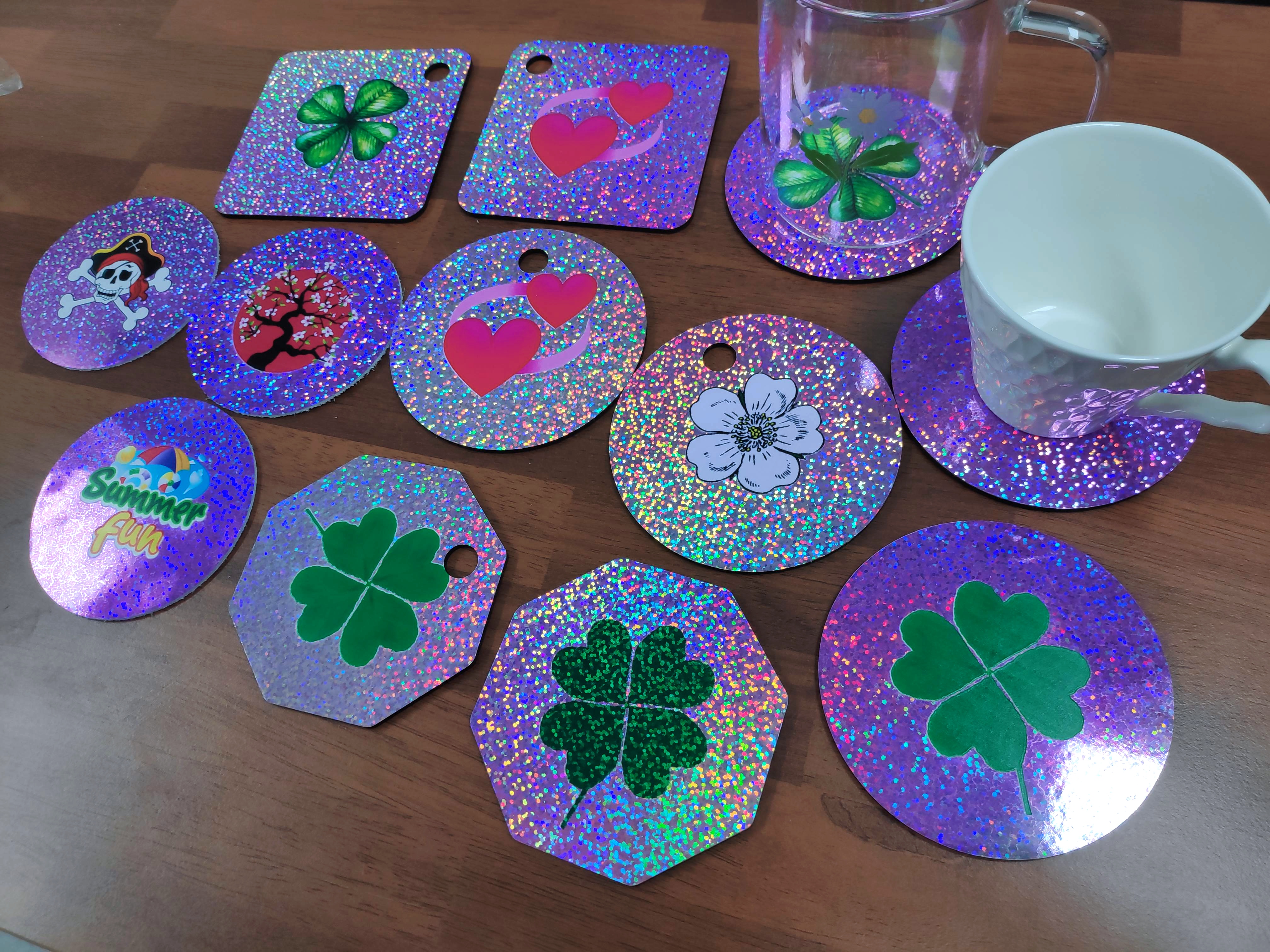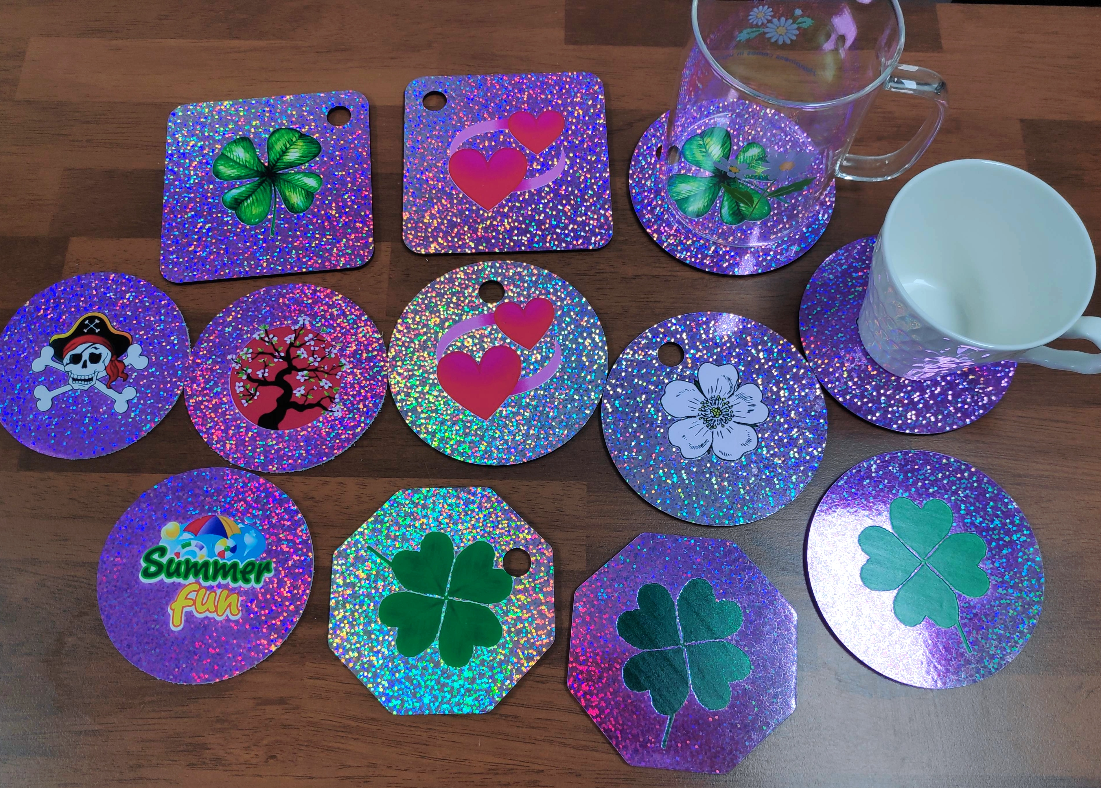 공통적으로 표면은 글리터링(glittering)효과로 반짝거리면서 홀로그램 느낌을 주며, UV프린팅기법으로 원하시는 도안(design)을 인쇄할 수 있습니다.
